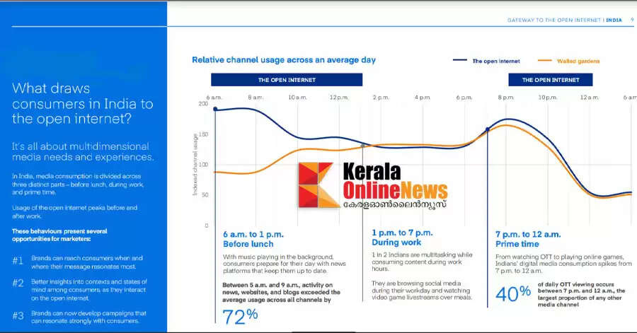 tRootC1469263">ഉപഭോക്താക്കള് ഡിജിറ്റല് മാധ്യമങ്ങളില് ഓരോ മാസവും ചെലവഴിക്കുന്ന ശരാശരി 307 മണിക്കൂറില് പകുതിയോളം (52 ശതമാനം) ഓപ്പണ് ഇന്റര്നെറ്റിലാണെന്നു പഠനം ചൂണ്ടിക്കാട്ടുന്നു. സാമൂഹ്യ മാധ്യമങ്ങള്, യൂസര് ജനറേറ്റഡ് കണ്ടന്റ്, ലൈവ് ഗെയിം സ്ട്രീമിങ് എന്നിവയില് നിന്നുള്ള മാറ്റമായാണ് ഇതിനെ കണക്കാക്കുന്നത്. എങ്കില് തന്നെയും വാള്ഡ് ഗാര്ഡന്സ് എന്നു വിളിക്കപ്പെട്ടുന്ന ഈ വിഭാഗം ഓപ്പണ് ഇന്റര്നെറ്റിനെ അപേക്ഷിച്ച് 5.5 മടങ്ങ് പരസ്യ ചെലവഴിക്കലാണ് ഇന്ത്യയില് നടത്തുന്നതെന്നും പഠനം ചൂണ്ടിക്കാട്ടുന്നു. ഇന്ത്യയിലെ ഡിജിറ്റല് പരസ്യ ബജറ്റിന്റെ 15 ശതമാനമാണിത്.