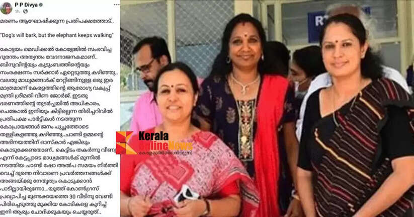 tRootC1469263">കൂടെയുള്ള ഒന്നിനെ എതിരാളികൾ വളഞ്ഞിട്ടു ആക്രമിക്കുമ്പോൾ കൂടെ നിൽക്കുകയെന്നത് ഓരോ കമ്യുണിസ്റ്റുകാരുടെയും കടമയാണെന്ന് പി.പി ദിവ്യ തൻ്റെ ഫെയ്സ്ബുക്ക് പോസ്റ്റിൽ കുറിച്ചു. ബിന്ദുവിൻ്റെ മരണം പ്രതിപക്ഷം ആഘോഷിക്കുകയാണെന്നും പി.പി ദിവ്യകുറ്റപ്പെടുത്തി. വലതുപക്ഷ മാധ്യമങ്ങൾക്ക് കിട്ടിയ ഒരു ഇര മാത്രമാണ് കേരളത്തിലെ ആരോഗ്യ വകുപ്പ് മന്ത്രി. ഇടതുഭരണത്തിൻ്റെ തുടർച്ചയിൽ അധികാരത്തിൻ്റെ ചെങ്കോൽ ഇനിയും കിട്ടുമോയെന്ന ആശങ്കയിലാണ് പ്രതിപക്ഷ പാർട്ടികൾ കോപ്രായ സമരങ്ങൾ നടത്തുന്നത്.