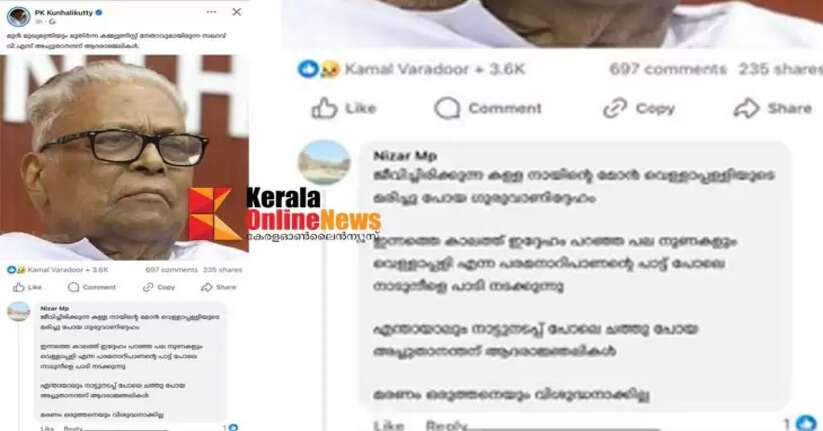 tRootC1469263">അന്തരിച്ച സി പി എം നേതാവും മുൻ മുഖ്യമന്ത്രിയുമായ വി.എസ്.അച്ചുതാനന്ദന് ആദരാഞ്ജലികൾ അർപ്പിച്ച് മുസ്ലിം ലീഗ് നേതാവും മുൻ മന്ത്രിയുമായ പി.കെ.കുഞ്ഞാലിക്കുട്ടി അദ്ദേഹത്തിൻ്റെ ഫെയ്സ് ബുക്കിൽ പോസ്റ്റിട്ടിരുന്നു. ഇതിനു താഴെ കമൻ്റ് ബോക്സിലാണ് വി എസിനെ അധിക്ഷേപിച്ചു കൊണ്ട് എം പി നിസാർ കമൻ്റിട്ടത്.ഇതിനെതിരെ മുസ്ലിം ലീഗിൽ നിന്നുൾപ്പെടെ വ്യാപക പ്രതിഷേധം ഉയർന്നു വന്നതിനു പിന്നാലെയാണ് ഇയാൾക്കെതിരെ നിയമ നടപടി ആവശ്യപ്പെട്ട് ഡിവൈഎഫ്ഐ നേതാക്കൾ പരാതി നൽകിയത്. സംഭവത്തിൽഇരിട്ടി പൊലിസ് കേസെടുത്ത് അന്വേഷണമാരംഭിച്ചിട്ടുണ്ട്.