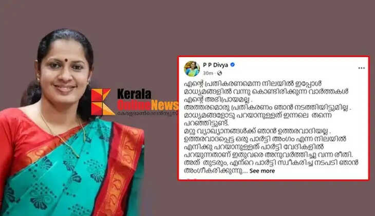 പ്രതികരണമെന്ന നിലയില് ഇപ്പോള് മാധ്യമങ്ങളില് വന്നു കൊണ്ടിരിക്കുന്ന വാര്ത്തകള് എന്റെ അഭിപ്രായമല്ലെന്ന് ദിവ്യ ഫേസ്ബുക്കിലൂടെ പ്രതികരിച്ചു. അത്തരമൊരു പ്രതികരണം ഞാന് നടത്തിയിട്ടില്ല. മാധ്യമങ്ങളോടു പറയാനുള്ളത് ഇന്നലെ തന്നെ പറഞ്ഞിട്ടുണ്ട്. മറ്റു വ്യാഖ്യാനങ്ങള്ക്ക് ഞാന് ഉത്തരവാദിയല്ല. ഉത്തരവാദപ്പെട്ട ഒരു പാര്ട്ടി അംഗം എന്ന നിലയില് എനിക്കു പറയാനുള്ളത് പാര്ട്ടി വേദികളില് പറയുന്നതാണ് ഇതുവരെ അനുവര്ത്തിച്ചു വന്ന രീതി. അത് തുടരും, എന്റെ പാര്ട്ടി സ്വീകരിച്ച നടപടി ഞാന് അംഗീകരിക്കുന്നെന്നും എന്റെ സഖാക്കളും സുഹൃത്തുക്കളും വ്യാജ പ്രചരണങ്ങളെ തള്ളിക്കളയണമെന്ന് അഭ്യര്ത്ഥിക്കുന്നതായും അവര് കുറിച്ചു.