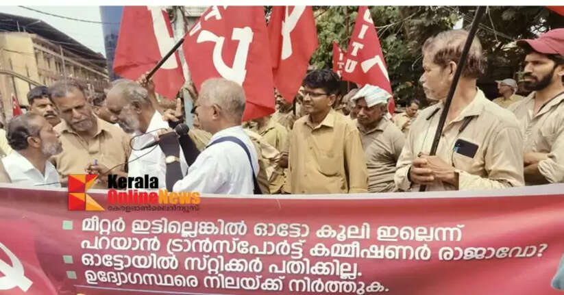 മീറ്റർ പ്രവർത്തിച്ചില്ലെങ്കിൽ യാത്ര സൗജന്യ ലെന്ന പോസ്റ്റ് പതിക്കുമെന്ന സർക്കുലർ പിൻവലിക്കുക: കണ്ണൂരിൽ ഓട്ടോറിക്ഷ തൊഴിലാളികൾ ആർ.ടി ഓഫിസ് മാർച്ച് നടത്തി