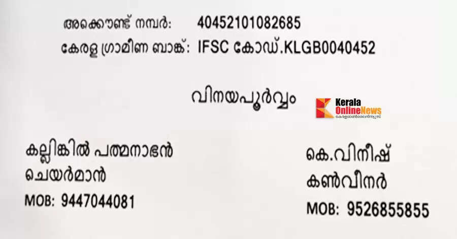 സഹായം അയക്കേണ്ടത് കേരള ഗ്രാമീൺ ബാങ്ക് തളിപ്പറമ്പ് ശാഖ അക്കൗണ്ട് നമ്പർ ► 40452101082685. IFSC CODE ▸ KLGB0040452.