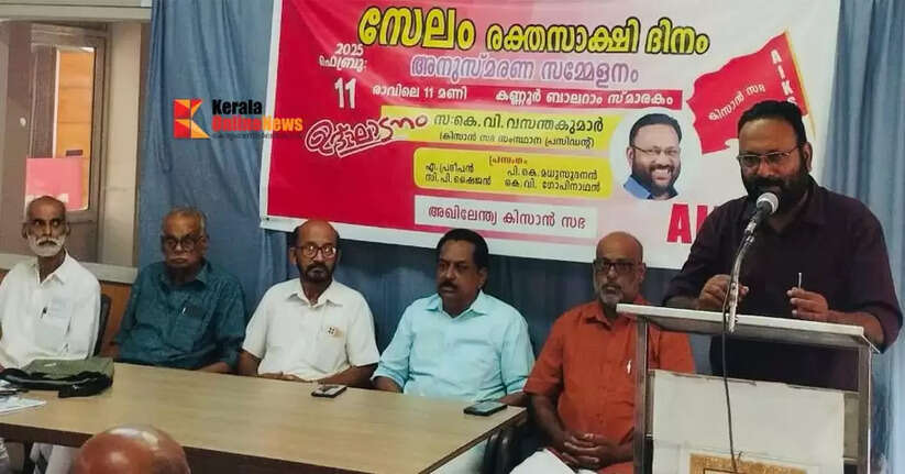 കണ്ണൂര് : സേലം രക്തസാക്ഷി ദിനത്തിന്റെ എഴുപത്തിയഞ്ചാം വാർഷികത്തോടനുബന്ധിച്ച് അഖിലേന്ത്യാ കിസാൻസഭ കണ്ണൂരിൽ സംഘടിപ്പിച്ച അനുസ്മരണ സമ്മേളനം കിസാന്സഭ സംസ്ഥാന പ്രസിഡന്റ് കെ വി വസന്തകുമാര് ഉദ്ഘാടനം ചെയ്തു.