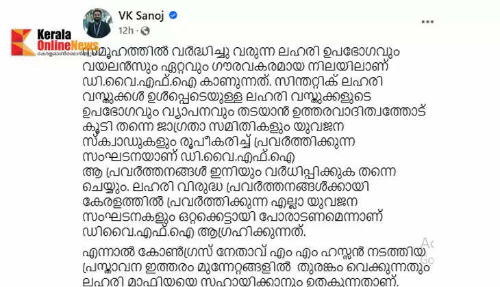 കേരളത്തിൽ മയക്കു മരുന്ന് വ്യാപനം തടയാൻ ശക്തമായ പ്രവർത്തനങ്ങൾ ഗ്രാസ് റൂട്ട് നിലയിൽ തന്നെ ഡിവൈഎഫ്ഐ ഏറ്റെടുക്കും. യോജിക്കാൻ സാധിക്കുന്ന സകല മനുഷ്യരേയും മയക്കു മരുന്നിനെതിരായ ജനകീയ യുദ്ധത്തിൽ കൂടെ കൂട്ടും. സമൂഹത്തോട് യാതൊരു ഉത്തരവാദിത്വവും പ്രകടിപ്പിക്കാതെ വിലകുറഞ്ഞ രാഷ്ട്രീയ ജൽപ്പനങ്ങൾ നടത്തുന്ന എംഎം ഹസ്സനെ പോലെ സ്വന്തം പാർടിക്കും പൊതു സമൂഹത്തിനും ഒരുപോലെ അന്യനായ നേതാവിന്റെ ജൽപ്പനങ്ങൾ അർഹിക്കുന്ന അവജ്ഞയോടെ തള്ളിക്കളയുന്നതായും സനോജ് കുറിച്ചു.