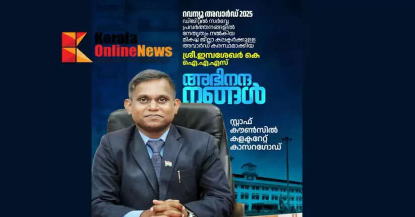 കാസർകോട് : ഡിജിറ്റൽ സർവേ പ്രവർത്തനങ്ങൾക്കുള്ള മികച്ച ജില്ലാ കലക്ടർക്കുള്ള സംസ്ഥാന പുരസ്കാരത്തിന് കാസർകോട് ജില്ലാ കലക്ടർ കെ ഇമ്പശേഖർ അർഹനായി .ജില്ലയിൽ ഡിജിറ്റൽ സർവേ പ്രവർത്തനങ്ങൾ ഏകോപിക്കുകയും മികച്ച രീതിയിൽ സംഘടിപ്പിക്കുകയും ചെയ്തതിനാണ് അവാർഡ് എന്ന് റവന്യൂ സർവേയും ഭൂ രഖയും വകുപ്പ് മന്ത്രി കെ രാജൻ അറിയിച്ചു. ഡിജിറ്റൽ സർവ്വേ പ്രവർത്തനങ്ങൾ മികച്ച രീതിയിൽ സംഘടിപ്പിക്കുന്നതിന് പ്രത്യേക അദാലത്തുകൾ വില്ലേജ് തലത്തിൽ ജില്ലാ കളക്ടർ സംഘടിപ്പിച്ചിരുന്നു സംസ്ഥാനത്ത് ആദ്യമായി ഡിജിറ്റൽ സർവ്വേ സമ്പൂർണ്ണമായി പൂർത്തിയാക്കിയ ഉജർഉൾവാർ വില്ലേജ് തളങ്കര ഉൾപ്പെടെയുള്ള വില്ലേജുകളിലും ജില്ലാ കലക്ടർ നേരിട്ട് സന്ദർശിച്ച് അദാലത്തുകൾ നടത്തി
